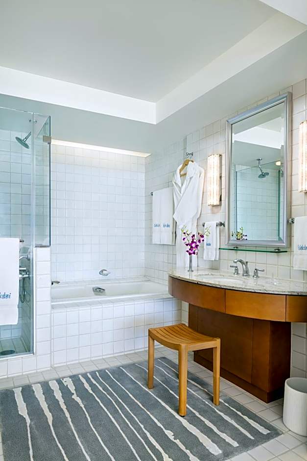Featuring a balcony with ocean views, this room features free Wi-Fi, and flat-screen cable TV. An private bathroom with plush bathrobes, premium toiletries, marble vanities, deep soaking tub and separate glassed-in shower is included. A welcome basket of fresh fruit and custom Halekulani chocolates is also provided.